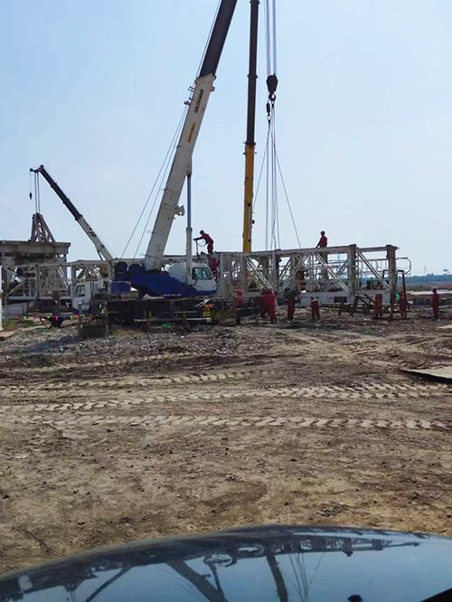 在石油鉆井作業(yè)過程中,鉆井設(shè)備及井架經(jīng)常需要搬遷、安裝和拆卸,現(xiàn)國內(nèi)石油鉆機(jī)(ZJ3000、ZJ4000、ZJ5000、ZJ7000、ZJ9000型)通常使用K型井架,分四節(jié)進(jìn)行運(yùn)輸、安裝和拆卸。井架在轉(zhuǎn)場搬遷過程中要放置到水平位置進(jìn)行安裝聯(lián)接或拆卸,作業(yè)人員需要在高空情況下完成幾十個(gè)大小聯(lián)接銷的聯(lián)接或拆卸(井架在水平狀態(tài)下,作業(yè)面離地面高度約有6米)。